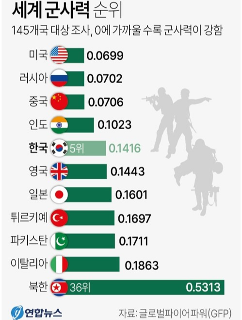 이어 세계5위의 强國이 됐고, 북한의 국방력은 36위권이다.